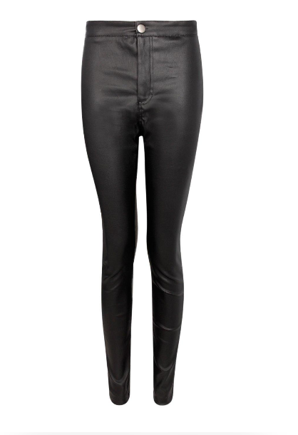 Faux Leather Pants High Waist Matte Skinny 95% Polyester. 5% Elastane. Discrete metal closure. Machine Washable. Model wearing Size 6. 32" inseam.